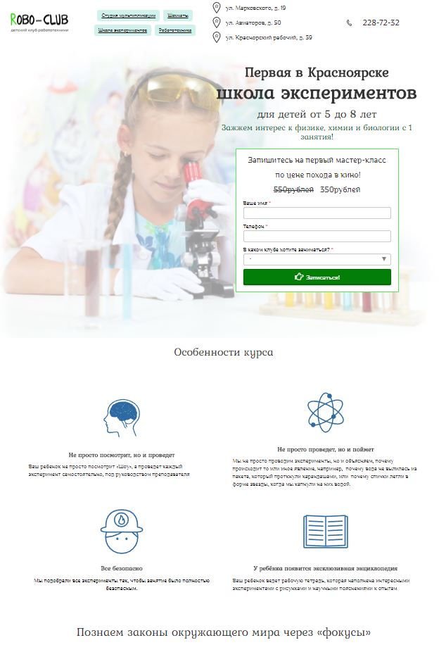 К каждому "курсу-локомотиву" (занятие, наиболее популярное у клиентов) мы создали свою посадочную страницу, ниже пара примеров: